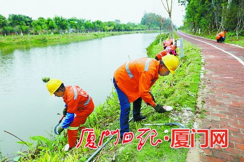 翔安莲溪畔,园林绿化工人正在对绿地进行养护。 (记者 张奇辉 摄)