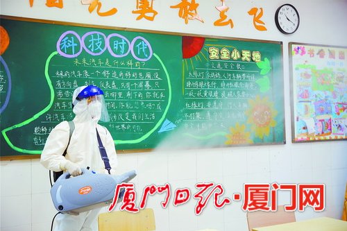 翔安二实小(演练中) 消毒组进到教室内消毒。
