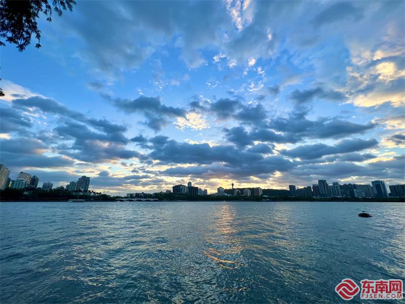 日落时分,云层低垂,夕阳霞光映照厦门筼筜湖。东南网记者 李霖 摄