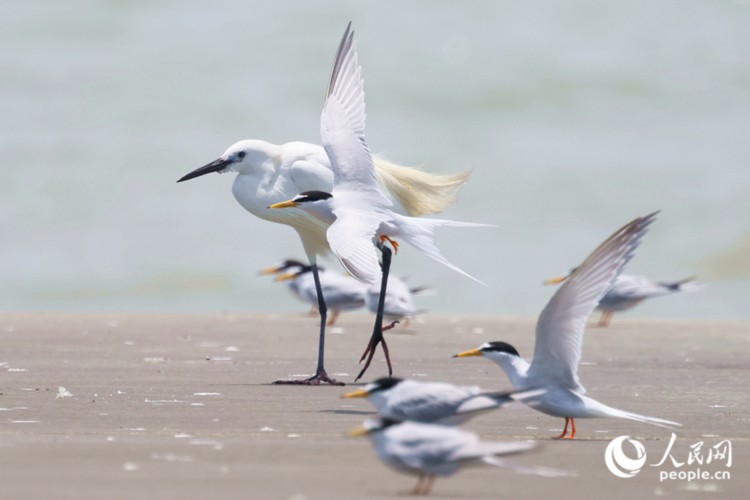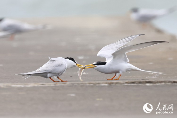 雄性白额燕鸥捕鱼归来,将“战利品”喂给雌鸟。人民网记者 陈博摄