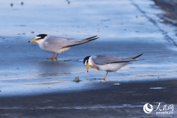 在堤岸上梳理羽毛的白额燕鸥。人民网记者 陈博摄