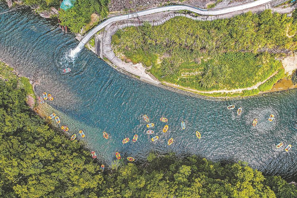 8月3日,寿宁县犀溪镇,游客乘坐皮筏漂流,在山谷溪流间乐享夏日清凉。暑假期间,犀溪漂流项目迎来旺季,各地游客纷纷前来体验皮筏漂流、高空漂流和游泳戏水,带动乡村民宿、农家乐等旅游业态发展,助力村民增收。(谢贵明 摄)