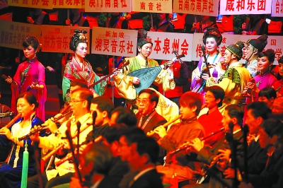 东南网-福建日报3月2日讯(本网记者 林熙 摄)昨日,第九届泉州南音国际大会在泉州举行。来自菲律宾、马来西亚、新加坡、印度尼西亚、日本及台港澳等地区的17个南音社团约380多人与泉州、厦门、漳州、三明等地南音团体300多人共襄盛举,参加人数和规模为历届之最。
