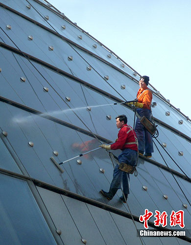 2月26日,北京,几位保洁人员正在对国家大剧院的外壁进行全面清洗,迎接全国“两会”召开。中新社发玉龙 摄图片来源:CNSPHOTO |