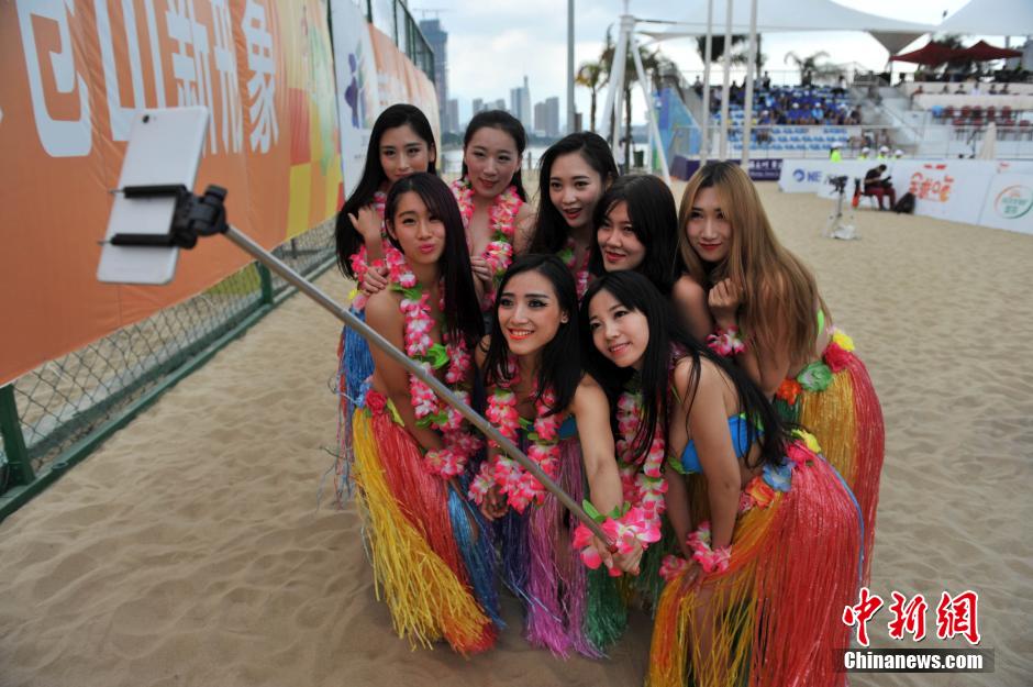 她们是来自北京的ZERO明星拉拉队队员,年龄在18-25岁之间,本职是大学生、空姐、警察、翻译等。她们因为共同的爱好聚在了一起,经常参加国内外大型赛事的表演。为了让观众每次都有不一样的感受,她们在8天的赛事中,准备了18-24套的舞蹈,并且配有不同的道具,如中国风的“功夫扇”“水袖舞”,还有“中东风情舞”“草裙舞”“牛仔舞”等。图为“沙滩宝贝”表演结束后在场边自拍。吕明 摄
