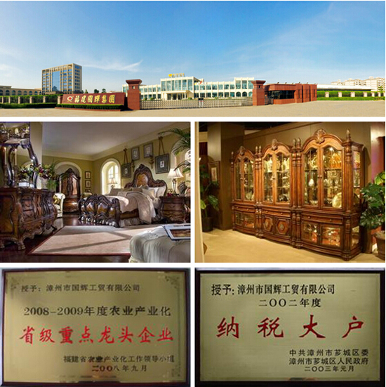 主要荣誉: 漳州市国辉工贸有限公司是中国家具协会副理事长单位、中国实木家具专业委员会副主任单位、中国家具行业优秀企业、福建文化产业示范基地、福建省林业产业化龙头企业、农业产业化省级重点龙头企业,已通过ISO9001、ISO14001、OHSAS18001三大体系认证,公司拥有家具技术创新中心和企业技术中心,先后荣获福建省著名商标、福建名牌产品、福建省企业知名字号、福建省国际知名品牌、福建省守合同重信用企业、福建省省级工业和信息化高成长企业、福建省纳税信用A级企业等荣誉称号。 地址:漳州市金峰工业开发区 |