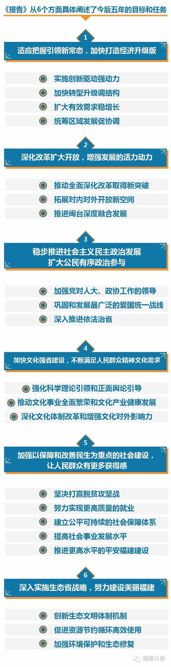 尤权在报告中指出,省第九次党代会以来的五年,是福建发展历程中极不平凡的五年。习近平总书记两次亲临福建考察,多次对福建工作作出重要指示,亲自为福建谋划未来,提出了建设机制活、产业优、百姓富、生态美的新福建和“四个切实”等重要要求,为我们指明了方向,给全省干部群众以极大的鼓舞。中央高度重视和支持福建加快发展,批准设立平潭综合实验区、中国(福建)自由贸易试验区、21世纪海上丝绸之路核心区、福州新区、福厦泉国家自主创新示范区、国家生态文明试验区等,进一步凸显了福建在全国发展大局中的地位和作用,为福建发展注入了强劲动力。 五年来,福建的发展令人瞩目。昨天屏山君做了梳理,可以戳这里阅读《福建人看过来,过去这五年我们的成绩单》。很多成绩在全国都是棒棒的。 《报告》中指出,回首过去5年的历程,我们深刻体会到,做好福建工作,有五个“必须坚持”: 5个必须 必须坚持深入学习贯彻习近平总书记系列重要讲话精神,牢固树立“四个意识”,始终在思想上政治上行动上同以习近平同志为核心的党中央保持高度一致,在服务全国大局中找准福建定位,在落实中央决策部署中展现福建作为; 必须坚持发展第一要务,积极适应经济发展新常态,牢固树立和落实新的发展理念,充分发挥福建的特色和优势,更加注重创新驱动和产业转型升级,更加注重生态建设和环境保护,努力实现发展速度与结构、质量、环境的相互协调; 必须坚持改革开放不动摇,以改革促开放,以开放促改革,破除体制机制障碍,营造良好发展环境,拓展对内对外开放空间,增强内生动力,激发发展活力; 必须坚持以人民为中心的发展理念,充分调动各方面的积极性、主动性和创造性,不断增进人民福祉,促进人的全面发展,使人民群众在发展中有更多的获得感; 必须坚持把严和实的要求贯穿于党的建设全过程、切实担负起从严管党治党的政治责任,引导党员干部敢于担当、真抓实干,不断把各项事业推向前进。这些经验体会弥足珍贵,我们要倍加珍惜、继续坚持。 今后的五年,是全面建成小康社会的决胜期,是全面深化改革的攻坚期,是全面依法治国和全面从严治党的关键期,也是加快福建各项事业发展的难得机遇期。报告认真贯彻习近平总书记系列重要讲话精神和对福建工作的重要指示,以“五位一体”总体布局和“四个全面”战略布局统揽全篇,立足福建省情,明确了今后五年省委工作的指导思想、主要目标任务,阐明了今后五年发展的大方向、大理念、大举措。全面开启实现“再上新台阶、建设新福建”的新征程。报告满满的干货,透露出未来五年发展的重量级信息,值得全省干部群众好好研读领会。我们通过数字来解读一下其中的关键信息。 1个总体要求 今后五年,我们工作的总体要求是:高举中国特色社会主义伟大旗帜,以马克思列宁主义、毛泽东思想、邓小平理论、“三个代表”重要思想、科学发展观为指导,深入贯彻习近平总书记系列重要讲话精神和对福建工作的重要指示,紧紧围绕“五位一体”总体布局和“四个全面”战略布局,牢固树立和落实五大发展理念,着力创新驱动和供给侧结构性改革,着力改善民生和创新社会治理,着力加强生态建设和环境保护,着力从严治党和优化政治生态,推动各项事业发展再上一个新台阶,实现全面建成小康社会目标,努力建设机制活、产业优、百姓富、生态美的新福建。 8方面奋斗目标 报告中列了8个方面的奋斗目标: 全面完成“十三五”规划确定的各项任务,地区生产总值增速高于全国平均水平,综合实力和竞争力显著提升; 产业结构持续优化,创新驱动成为发展的主引擎,形成以先进制造业和现代服务业为主体、特色现代农业为基础的现代产业体系; 重点领域和关键环节改革取得新的突破,对外开放领域扩大、质量提升,发展活力和动力不断增强; 城乡居民收入保持较快增长,现行标准下贫困人口全部脱贫,城乡基本公共服务均等化水平进一步提高; 文化强省建设迈出新步伐,社会主义核心价值观深入人心,文化影响力和公民素质不断提升; 法治福建建设成效明显,社会治理体系更加完善,社会更加和谐稳定; 生态环境质量继续保持全国领先,率先建成较为完善的生态文明制度体系; 从严管党治党责任进一步落实,各级党组织创造力、凝聚力、战斗力显著增强,广大党员干部先锋模范作用充分发挥。 10个字的中心任务 今后五年的中心任务,归结起来就是:“再上新台阶、建设新福建”。“建设新福建”,是习近平总书记为我省擘画的宏伟蓝图,就是要按照“机制活、产业优、百姓富、生态美”的要求,增强发展活力,提高发展质量,改善民生福祉,营造良好环境,推动福建在新的历史起点上实现更高水平的发展;“再上新台阶”,是“建设新福建”的阶段目标要求,就是要在建党100周年前全面建成小康社会,为实现党的第一个百年奋斗目标作出福建应有的贡献。我们不仅要在经济总量、综合实力上有大幅提升,而且要在产业结构、社会事业、城乡区域协调、生态环境质量、人民生活水平、党风廉洁建设等各方面取得新的进展,为今后更长时期的发展打下基础、提供支撑。“再上新台阶、建设新福建”,是今后五年福建发展的主旋律、最强音。 “再上新台阶、建设新福建”必须成为全省干部群众的共识和行动。各级各