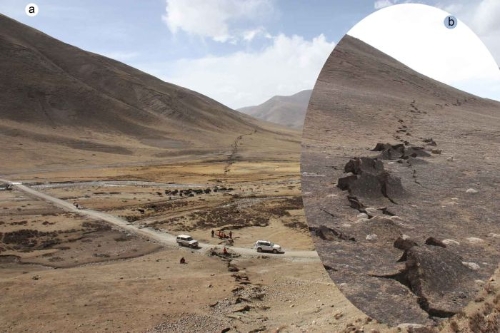 图2 断层活动的基本方式及实例:a,上下运动方式。b,水平运动方式,图片来自KarlMueller。 2.地震,在玉树草原切了一道伤口 在普通大众的眼里,地震一般是山崩地裂、房倒屋塌。确实,地震时会发生“地裂”。这是因为,地震是断层活动引起的,断层运动时会将断裂两侧的地层错开,在地表产生破裂。这就像大地被划了一道口子。地震产生的地表破裂带,包含了关于地震断层的许多信息,成为我们认识断层活动的突破口。