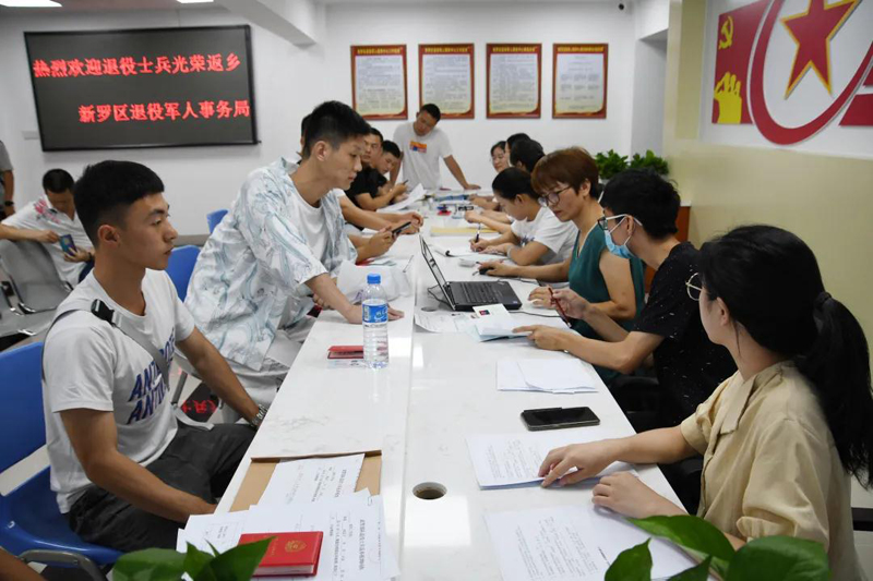 9月3日,在龙岩市新罗区的退役军人服务中心大厅,一群意气风发、洋溢笑容的退役士兵在服务中心工作人员的热情服务下,有序便捷地办理着接收报到、社保医保关系转接等相关手续。