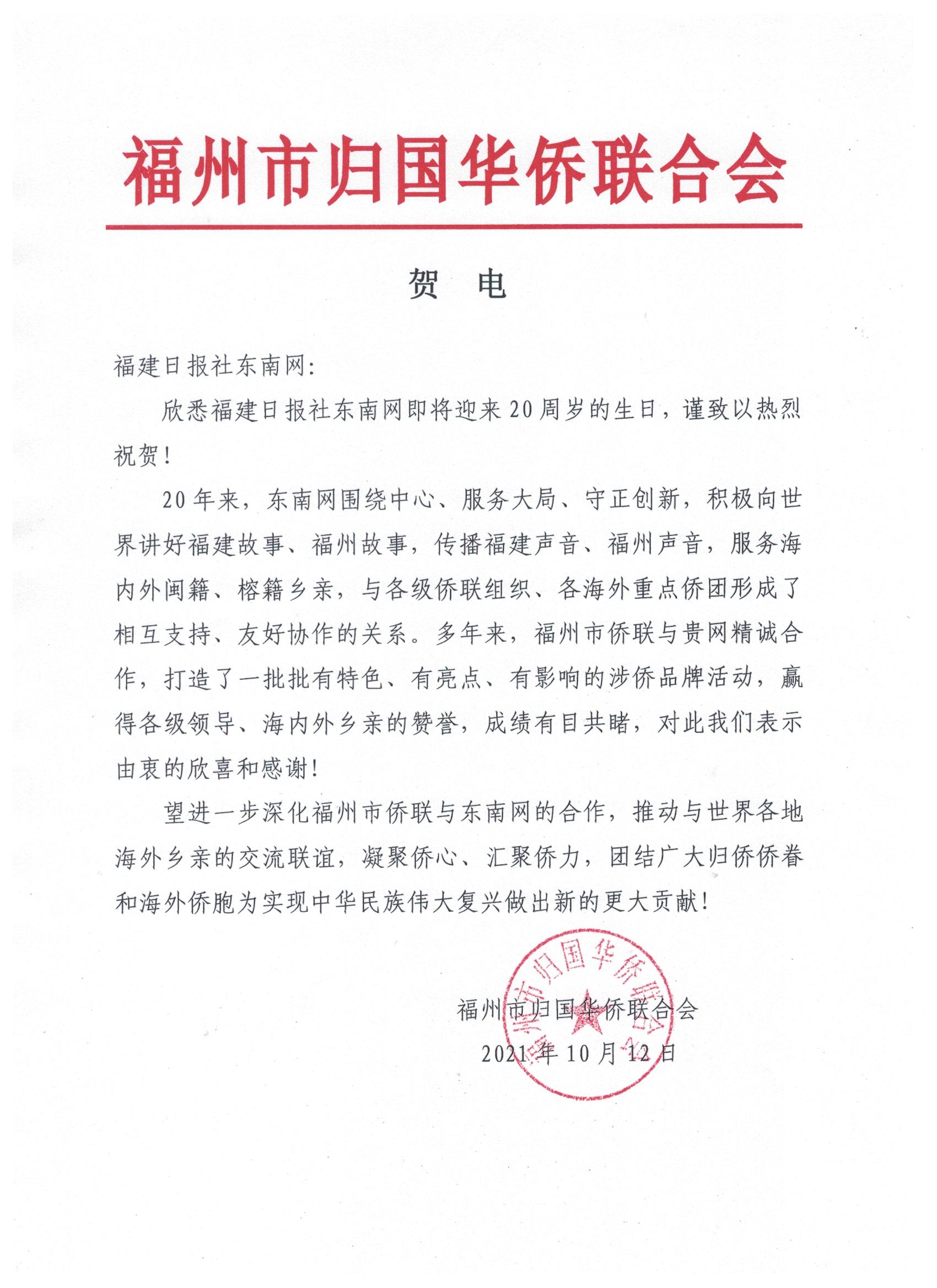 福州市归国华侨联合会贺信