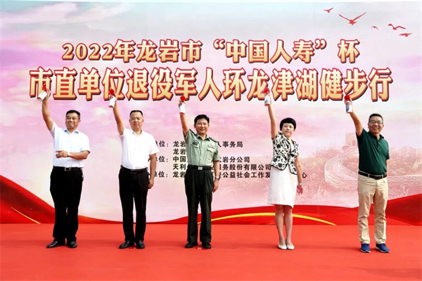 为庆祝中国人民解放军建军95周年,展示龙岩市退役军人凝心聚力建设闽西革命老区高质量发展示范区的新风貌,营造祥和、健康、文明的社会氛围,喜迎党的二十大召开,7月26日,来自龙岩市直各单位的500余名退役军人齐聚龙津湖,参加由龙岩市退役军人事务局联合市体育局举办的2022年龙岩市“中国人寿”杯市直单位退役军人环龙津湖健步行活动。 活动在庄严的国歌声中拉开序幕。龙岩市退役军人事务局党组书记、局长张华玉致辞,军分区石海东政委宣布活动开始,出席活动的领导和嘉宾一起按响鸣枪汽笛。