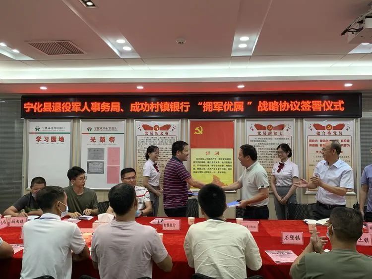 9月16日,宁化县退役军人事务局与成功村镇银行签署拥军优属战略合作协议,共同探索新时代社会化拥军优抚工作的新模式、新路子,为广大退役军人及优抚对象提供更好的优待服务。宁化县退役军人事务局局长范鹏举、成功村镇银行董事长马先辉、各乡(镇)退役军人服务站负责人等出席仪式。