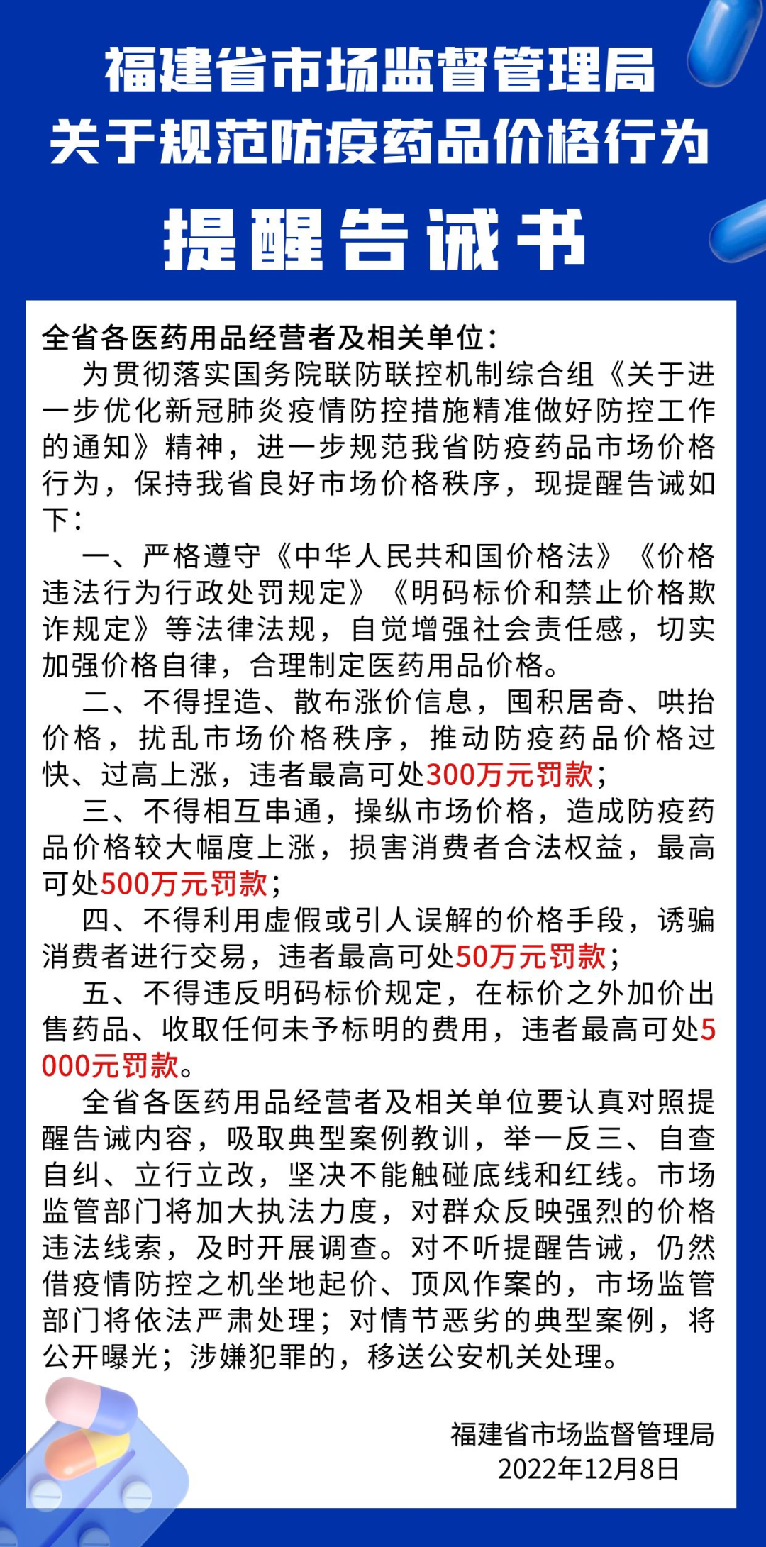福建九州通医药有限公司、福建同春药业股份有限公司、国药控股福州有限公司、福建康佰家医药集团有限公司、福州海王星辰健康药房连锁有限公司、福建宜又佳医药连锁有限公司相关负责人参加了提醒告诫会,并当场签署保供稳价承诺书,承诺严格履行法律责任,做到诚信守法经营、维护价格稳定,全力保障正常销售经营,及时订货补货,做好必要的应急储备和消费引导,努力让人民群众买到质量可靠、价格合理的防疫物资。