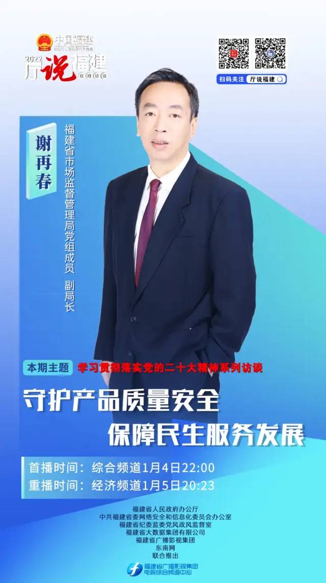 由福建省人民政府办公厅、省委网信办、省纪委监委党风政风监督室主办,省大数据集团有限公司、省广播影视集团、东南网承办的全媒体政务访谈类节目《中国福建·在线访谈—厅说福建2022》将于1月4日22:00在综合频道首播,1月5日20:23在经济频道重播。 本期节目邀请福建省市场监督管理局党组成员、副局长谢再春做客演播厅,与参与“云连线”来自厦门市市场监督管理局、省产品质量检验研究院、省纤维检验中心和一些企业的朋友共话福建省工业产品质量安全情况。