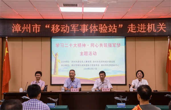 “学习二十大精神,同心共筑强军梦”。6月27日,漳州市“移动军事体验站”首次走进漳州市风景园林中心,面向机关干部职工开展国防教育。以此纪念延安双拥运动80周年,推动全民国防教育走深走实。漳州市住建局、漳州市风景园林中心50余人参加活动,漳州市退役军人事务局党组成员、副局长杨裕勇致词。 活动前,军休科技志愿服务队员陈瑞梅结合近期国防形势,为干部职工开展《守卫祖国空域》国防教育课。陈瑞梅从歼-20、轰6K、空警500三种机型的性能特点、空域作战能力、未来战争组合拳出发,图文并茂式向干部职工介绍了我军近年来军事武器装备的发展历程。