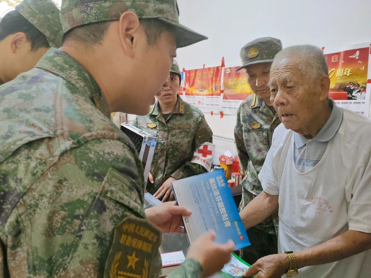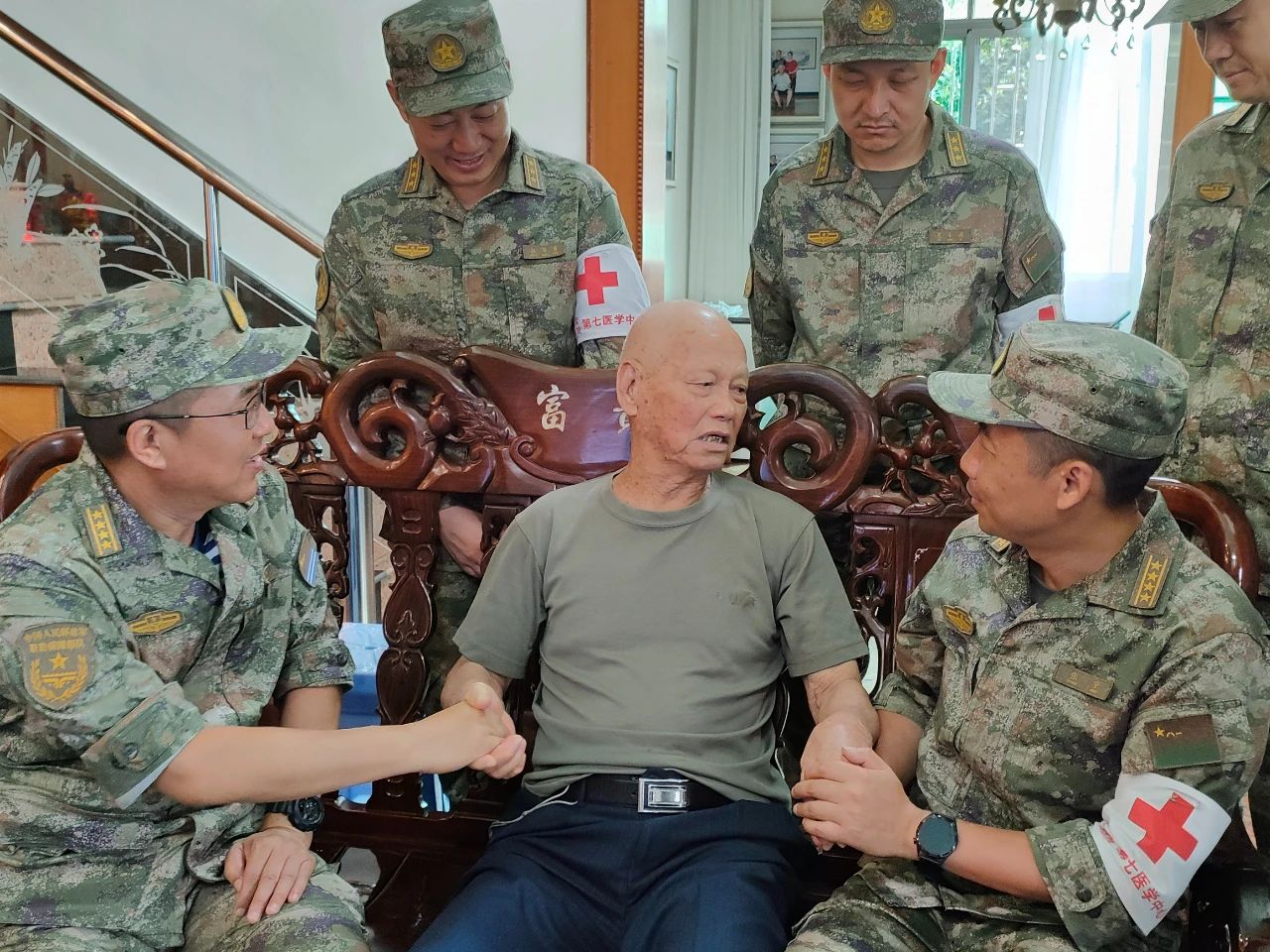 随后,医疗队先后来到参加过东山保卫战的老兵林英良、王丁太、朱全义、孙狮家中走访义诊。在老兵家中,该医疗队心血管内科、消化内科、神经外科等多位科室专家耐心细致地询问老兵身体状况,为老兵免费体检,并针对个人情况给出治疗建议,赠送药物。同时,医疗队们还聆听了老兵讲述在东山保卫战中的战斗故事,近距离感受前辈们曾经英勇战斗的光辉事迹。 “我老了,不然我还想当兵。”看到新时代军人的飒爽英姿,王丁太一边赞叹固我国防、使命光荣,一边禁不住回忆起自己的军旅时光,眼里饱含深情的泪花。1953年,王丁太时任公安80团班长,在东山保卫战中英勇奋战,表现突出,荣立二等功。 “您是功臣!党和军队始终惦记着像您这样保家卫国、勇于牺牲奉献的老兵!”一旁医院领导如是说道。