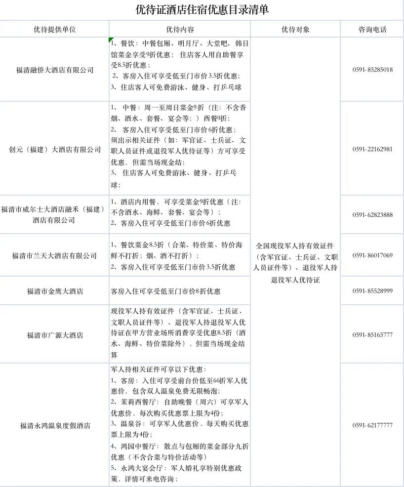 根据协议,福清融侨大酒店有限公司、创元(福建)大酒店有限公司、福清市威尔士大酒店融禾(福建)酒店有限公司、福清市兰天大酒店有限公司、福清市金鹰大酒店有限公司、福清市广源大酒店、福清市永鸿温泉度假酒店将提供以下优待: