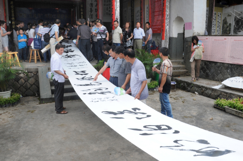 福建省环境保护宣传教育中心在福州市首批十佳最美文化村罗源县飞竹镇守善村举办“百姓富、生态美”环保宣教进乡村主题书画展活动。活动期间举办了书画家现场笔会和书画作品展。数十名书法家、画家,守善村当地书画家及热心环保的我省各界书画爱好者,在现场以书画展示的方式传递生态环保理念,倡导绿色生活方式,弘扬中国传统文化。现场共展出了全省各地书画家选送的书法和绘画作品150余幅。参展作品围绕环保主题,内容丰富,形式多样,生动展现了人与自然和谐相处的理念与图景。