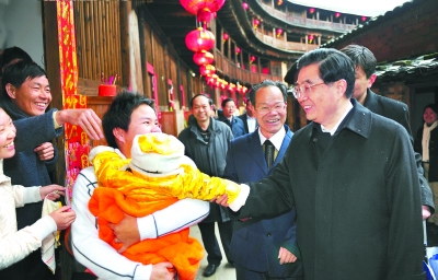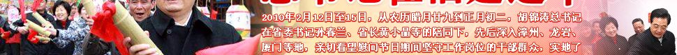 | 胡锦涛总书记再次瞻仰古田会议会址,和老区群众一起过除夕,不仅让大家感受到了党中央的温暖,更带动了今年春节古田红色旅游的空前火爆,这是老区人民的福气! |