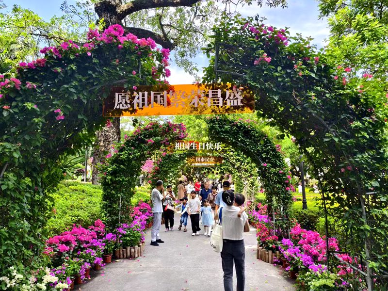 到处盛开着三角梅的公园中,还有随处可见的欢庆国庆的拍照打卡点,市民游客用各自的方式在这个举国欢庆的时刻,共同祝福祖国母亲生日快乐。